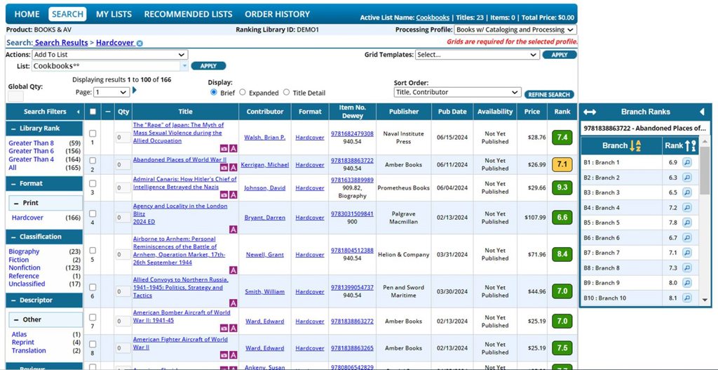 Bibz Analytics Select with Confidence Introducing a powerful new collection development tool that equips librarians with the information needed to take their selection process to the next level. Bibz Analytics harnesses circulation data from a library’s own ILS to provide ranking information on forthcoming titles. By analyzing past circulation performance of similar titles, Bibz Analytics’ predictive engine provides circulation potential for not-yet-published titles. Armed with this information, librarians can confidently incorporate new titles into their system-wide or individual branch collections, ensuring informed selection and strategic branch placement. Benefits: Provides predictive performance analysis, immediately quantifying potential interest for forthcoming titles while identifying underperforming titles Calculates circulation potential for the library system, as well the unique ability to view title rankings for each branch Introduces a scientific element for collection development, through data-driven comparative analysis Integrates seamlessly within Brodart’s Bibz user interface, providing instant review within Bibz lists and searches – including order grids Allows collection development librarians to curate and purchase with confidence, thereby maximizing the impact of library budgets Enables comparative analysis for collection development, through title rankings — allowing prioritization of titles based on their predicted performance Helps librarians manage their overall collections more efficiently and effectively Sample screen shot — rankings of individual titles, broken out by the branch level: Check back soon for more information!